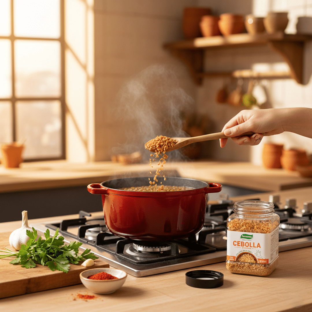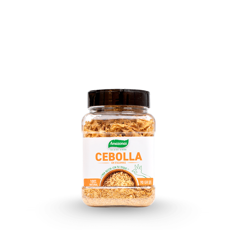 La cebolla en escamas es un condimento práctico y aromático, elaborado con cebolla deshidratada de sabor natural. Se rehidrata fácilmente y realza sopas, guisos, salsas y adobos. Ideal para dar sabor auténtico sin picar cebolla fresca.